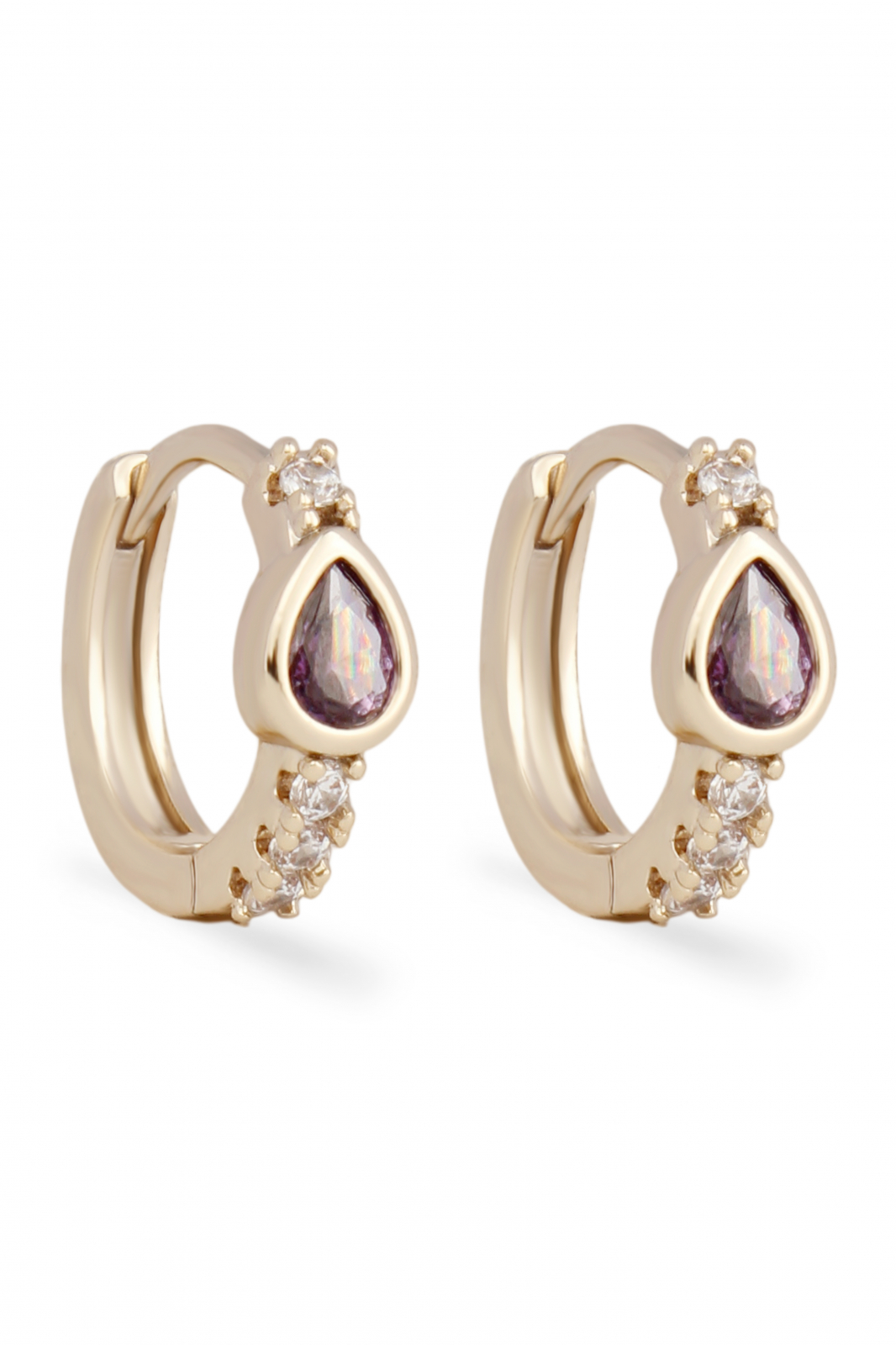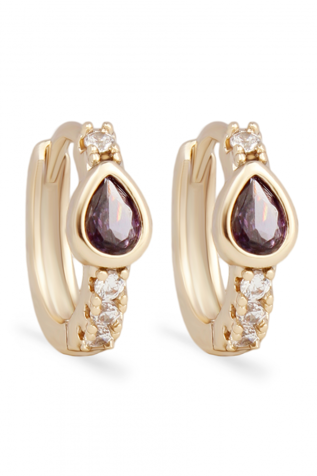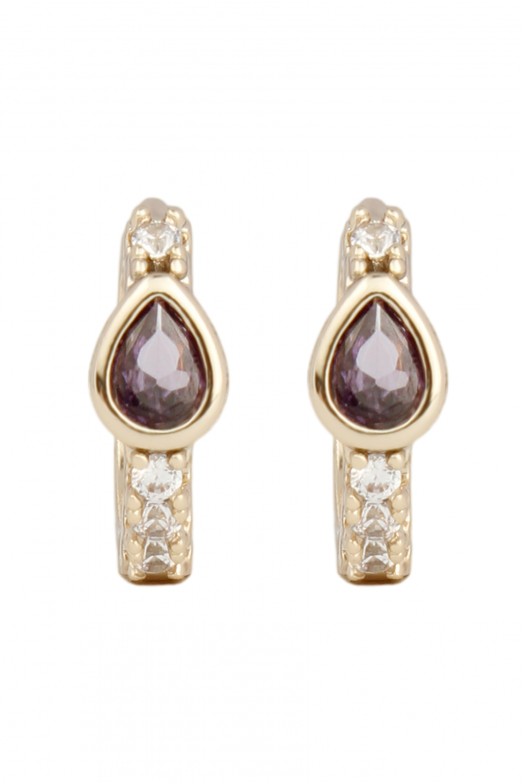 Cercei placați cu aur 18k, cu pietre de zirconiu  în nuanțe de alb și mov, ce conferă un stil rafinat și elegant.