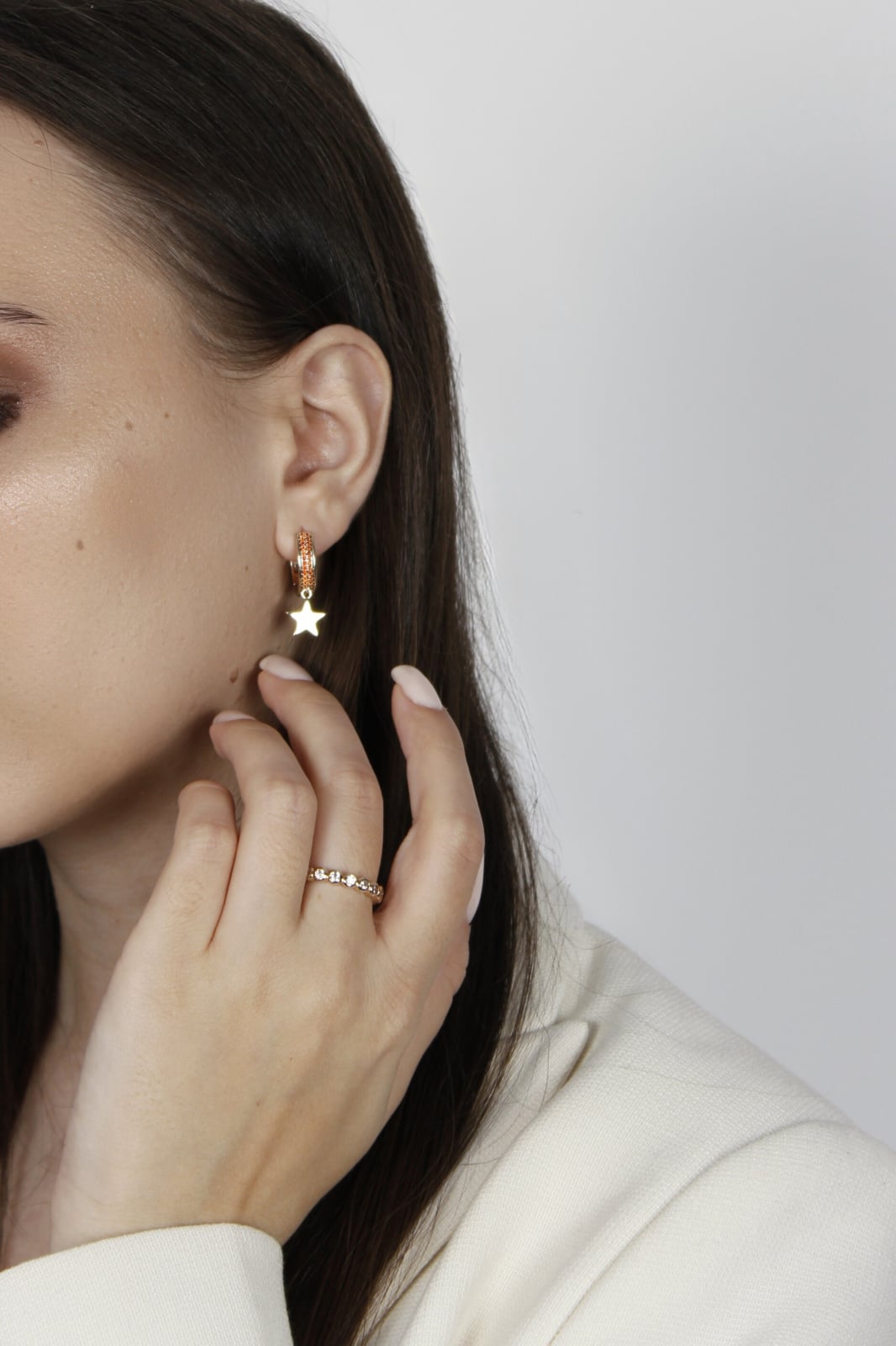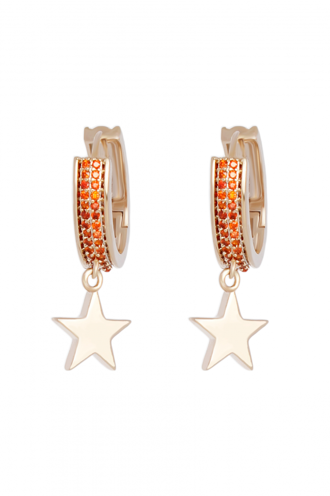 Cercei placați cu aur 18k, cu pietre de zirconiu minimaliste în nuanțe de roșu, și pandantive în formă de stea.