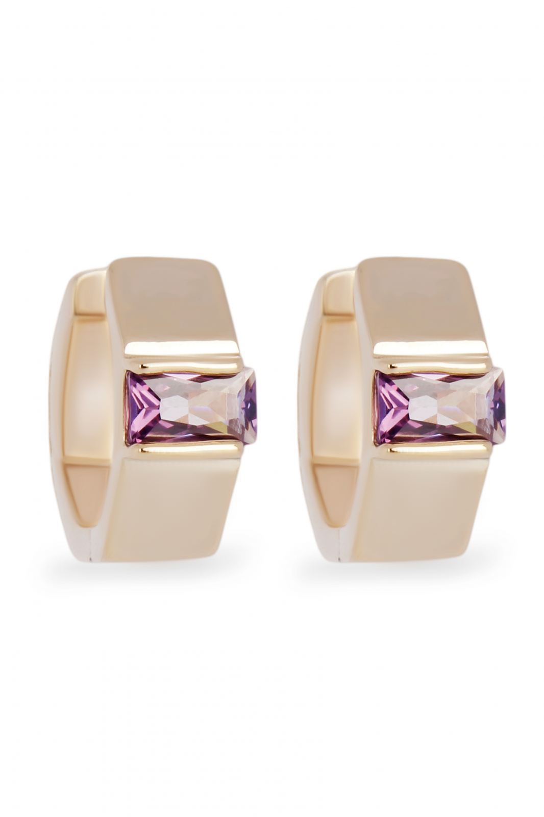 Cercei placați cu aur 18k, cu pietre de zirconiu roz, aranjate intr-o forma geometrică cu un design elegant.