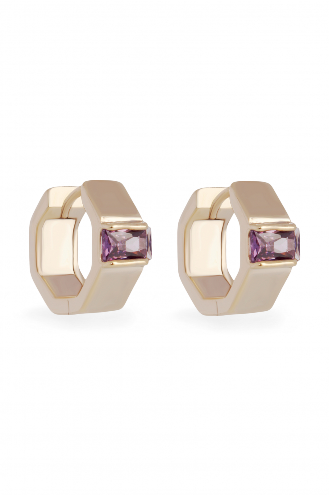 Simpli și rafinați, acești cercei minimalisti au ca element central o piatră zirconiu mică, în nuanță mov. Culoarea subtilă adaugă un detaliu discret de culoare, perfect pentru zilele în care vrei un accesoriu simplu, dar cu personalitate. Pot fi purtați individual sau combinați cu alte bijuterii pentru un look mai complex.