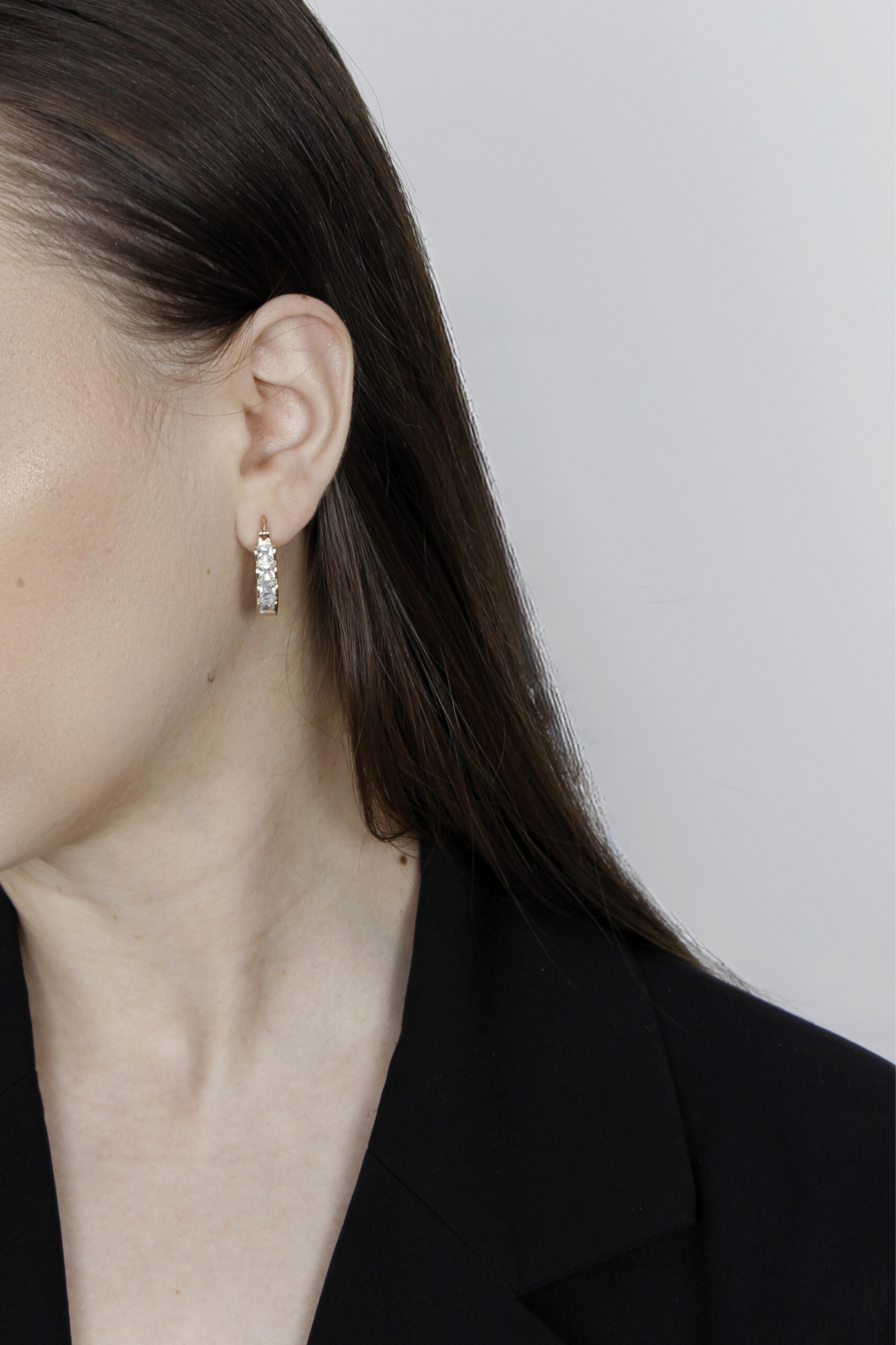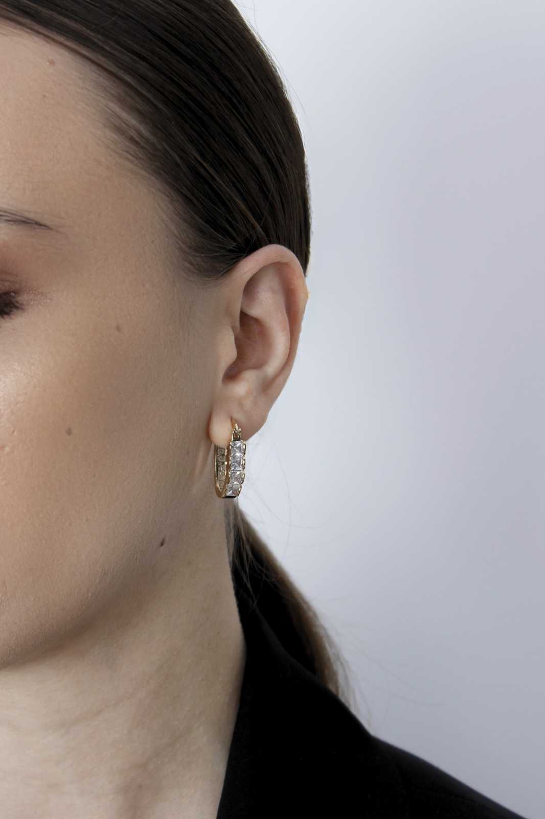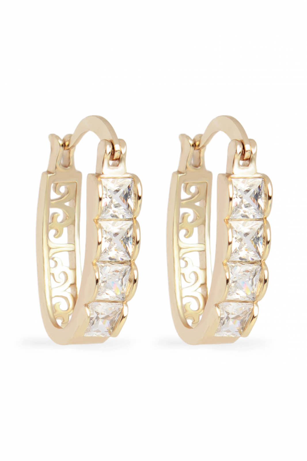 Cercei placați cu aur 18k, accesorizați cu pietre albe de zirconiu cu un design rafinat și strălucitor.