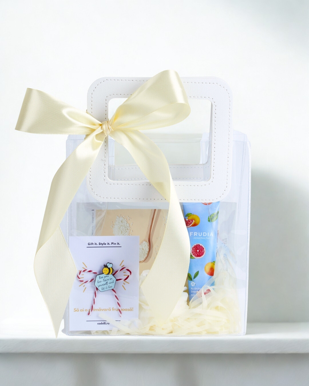 O geantă cadou cu estetică luminoasă și detalii fine, potrivită pentru perioada 1–8 Martie. Fundița satinată și designul transparent pun în valoare produsele din interior, oferind un aspect curat și elegant. Ideală pentru surprize feminine, simbolice și atent pregătite.