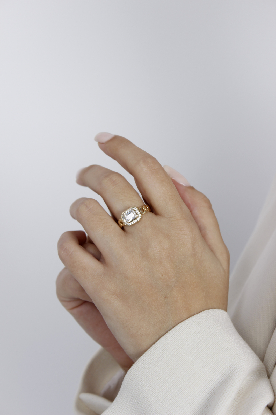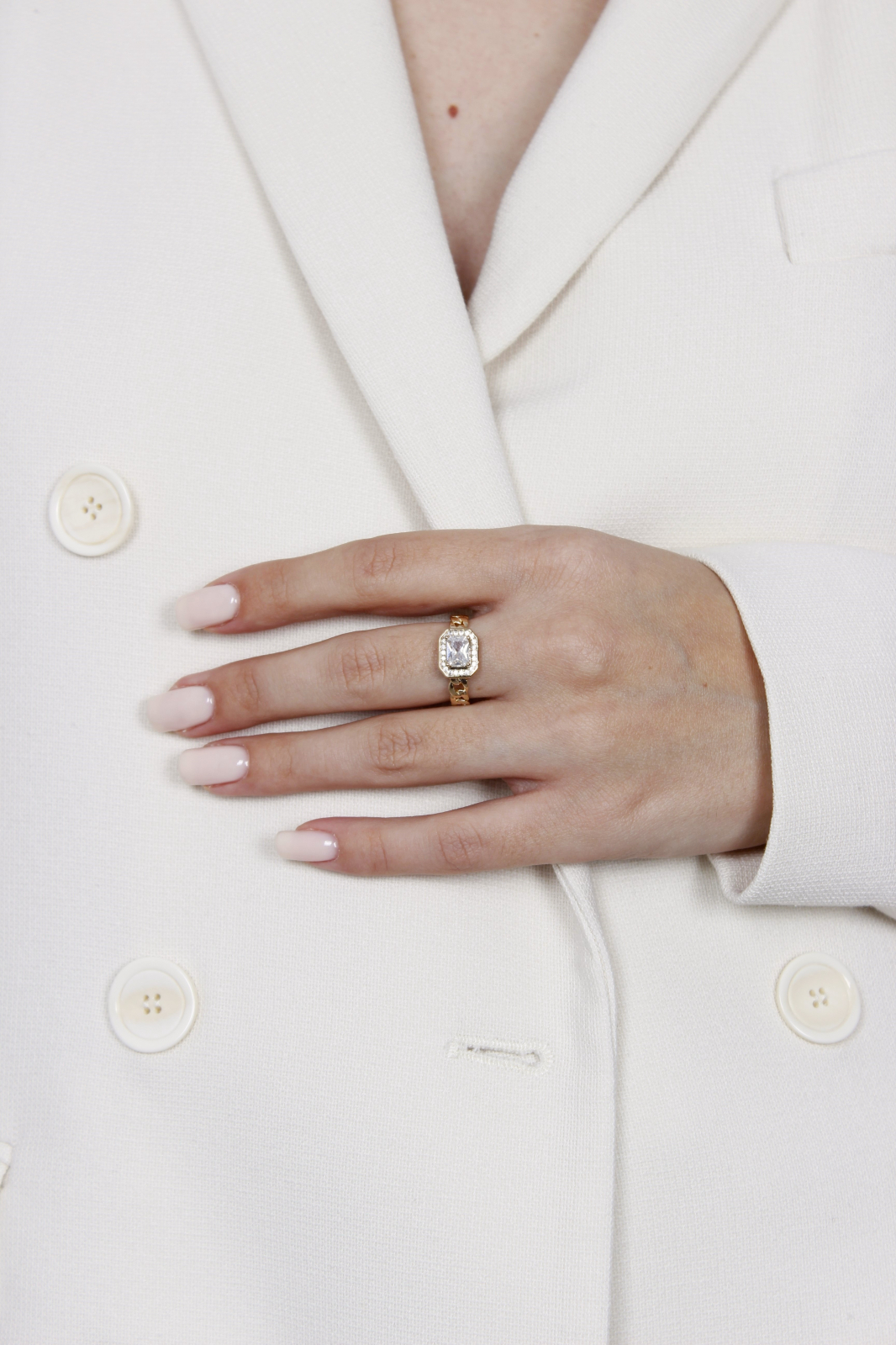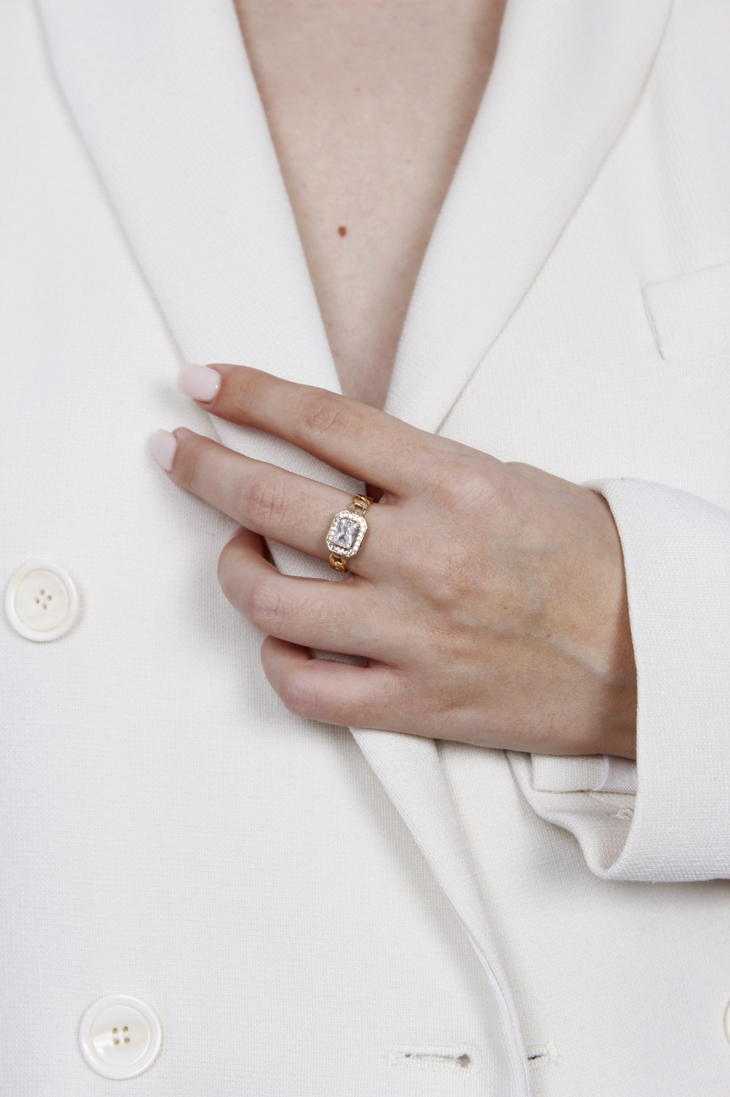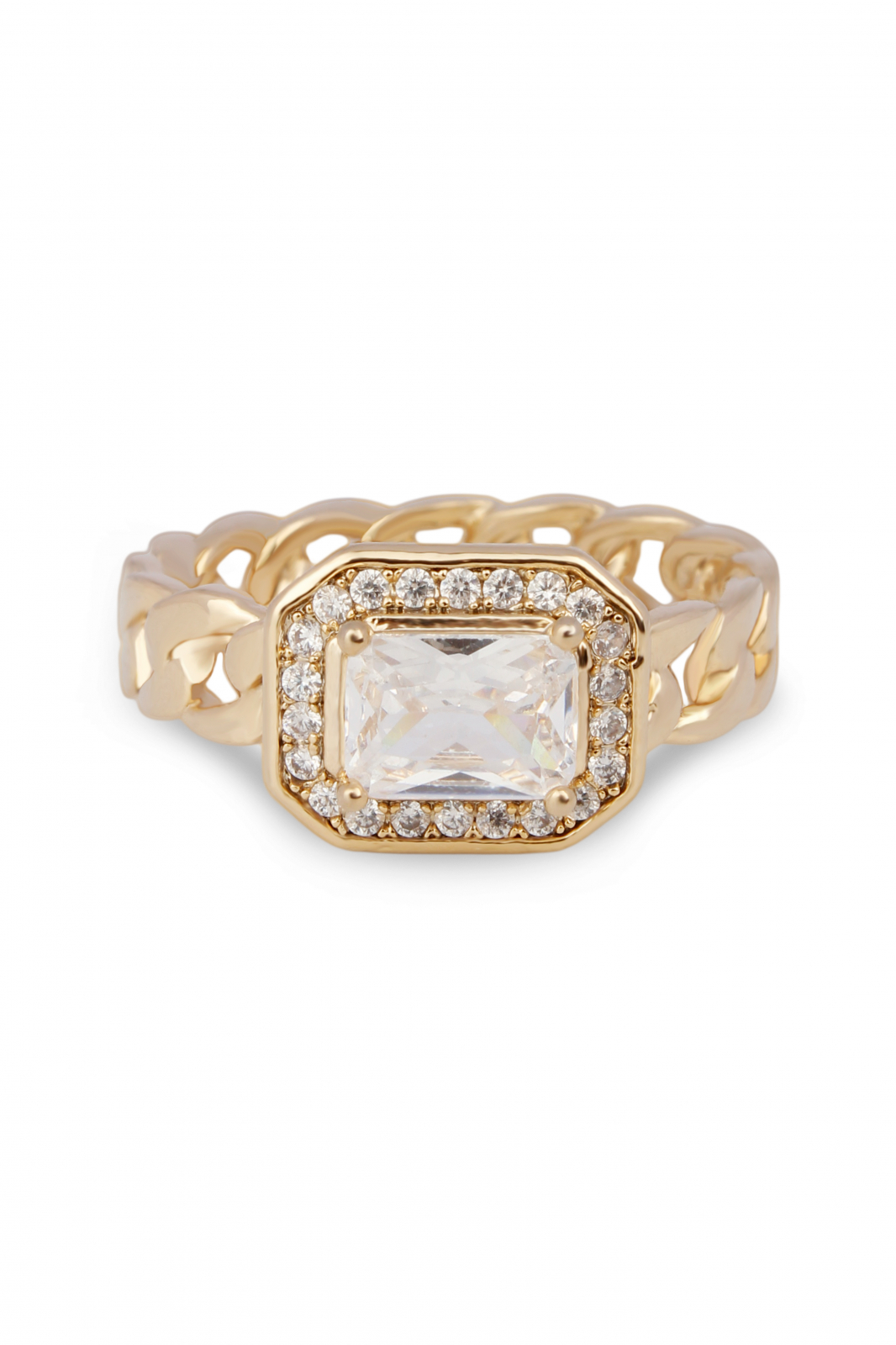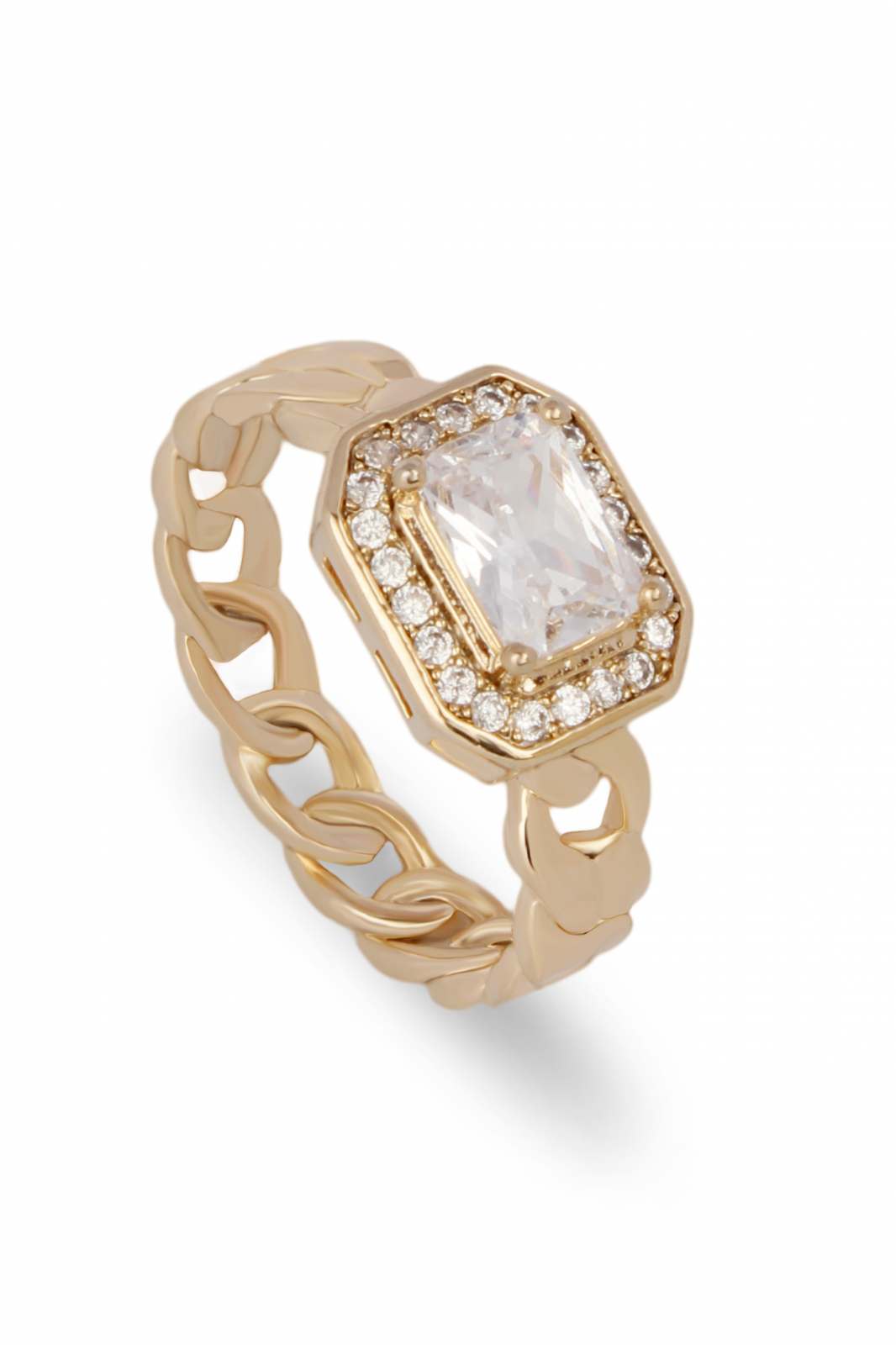 Inel placat cu aur 18k, cu o piatră mare de zirconiu alb, într-un design modern.