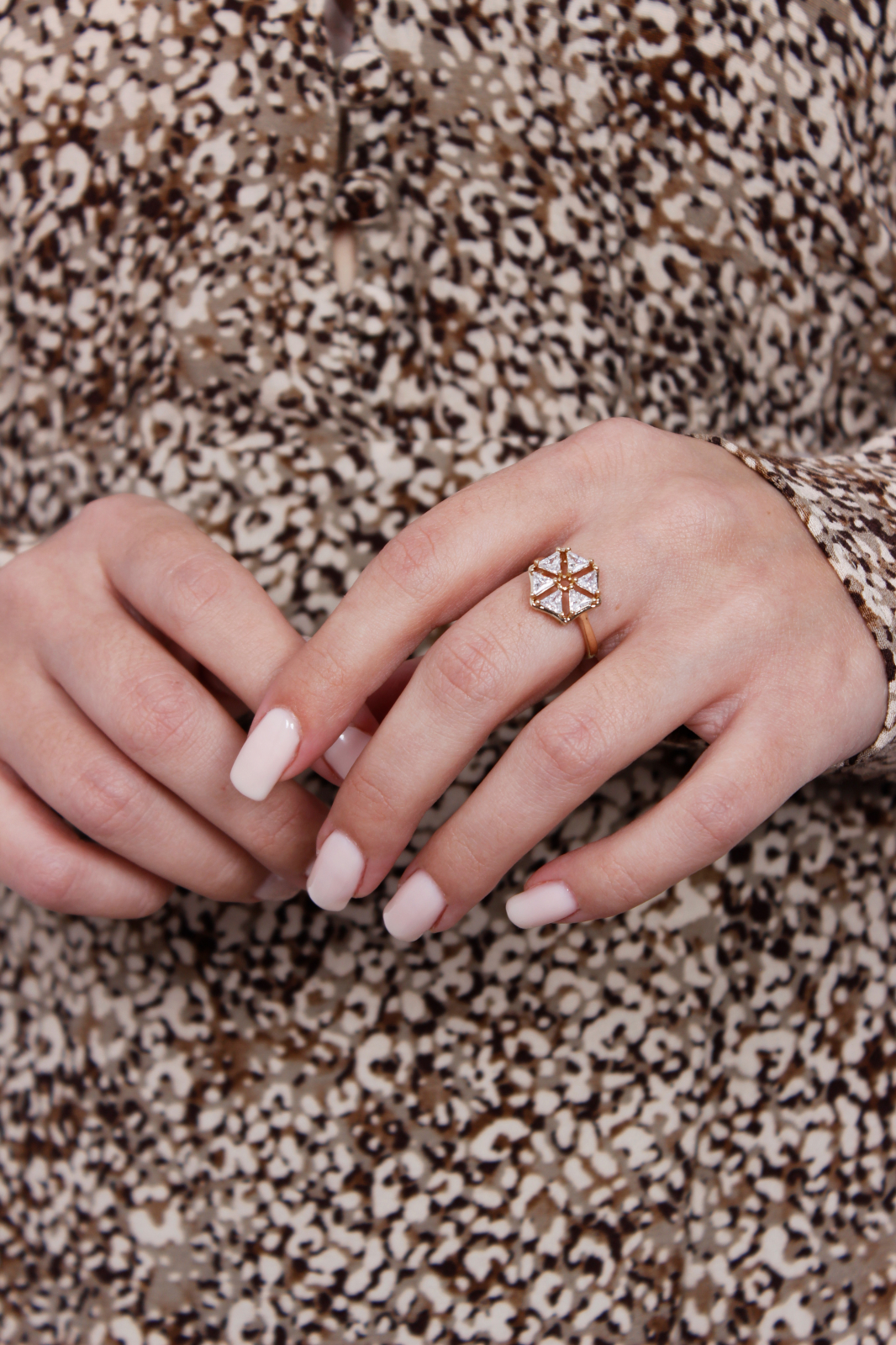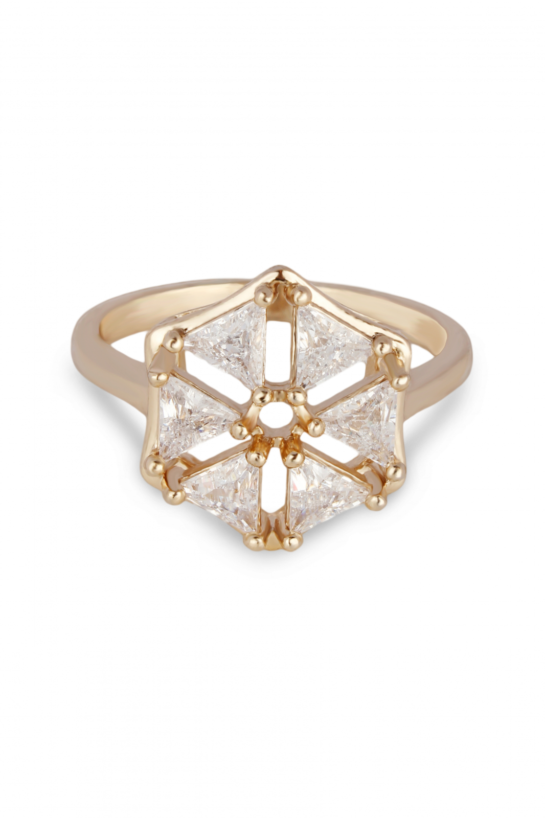 Inel cu pietre mari de zirconiu, aranjate armonios în formă de hexagon. Jocul de linii drepte și strălucirea intensă a pietrelor creează un efect vizual puternic, perfect pentru persoanele care își doresc bijuterii cu personalitate. Inelul adaugă un aer contemporan și elegant ținutelor, fiind o alegere ideală pentru ocazii speciale sau pentru a aduce un accent sofisticat stilului zilnic.