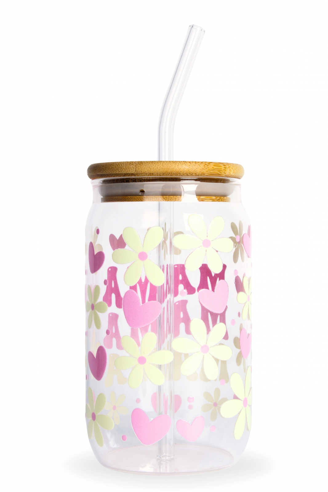 Pahar din sticlă borosilicată, capac din bambus natural și pai tot din sticlă — ideal pentru băuturi reci și calde. Personalizare realizată cu folie UV DTF dublu printată, rezistentă la zgârieturi și apă, cu imprimeu vizibil și din interiorul paharului. Folia se fixează prin adeziv UV curabil, oferind aderență superioară și imprimare intensă, durabilă în timp.